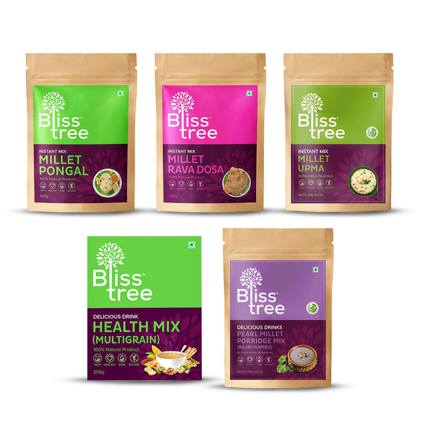 Includes - Millet Rava Dosa, Millet Pongal, Millet Upma, Pearl Millet Porridge Mix,  Multigrain Millet Drink Mix