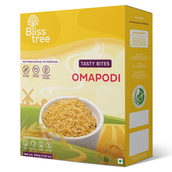 Seasoned with Ajwain, Chili Powder, Turmeric Powder, and a hint of salt before being deep-fried. Bliss Tree's Omapodi is a flavourful, crunchy, light, and healthy traditional Indian snack. Key Features:...