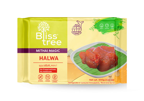 Introducing Bliss Tree Halwa - the epitome of Indian sweetness! Lifted by air to bring you the freshest flavors straight to your doorstep. Indulge guilt-free with no preservatives or additives, just pure bliss in every bite. With its new elegant packaging, it's not only a treat for your taste buds but also a perfect gift for your loved ones. Simply warm and serve this delectable creation made with pure ghee, and experience a slice of heaven in every mouthful. Taste the tradition, savor the moment with Bliss Tree Halwa.